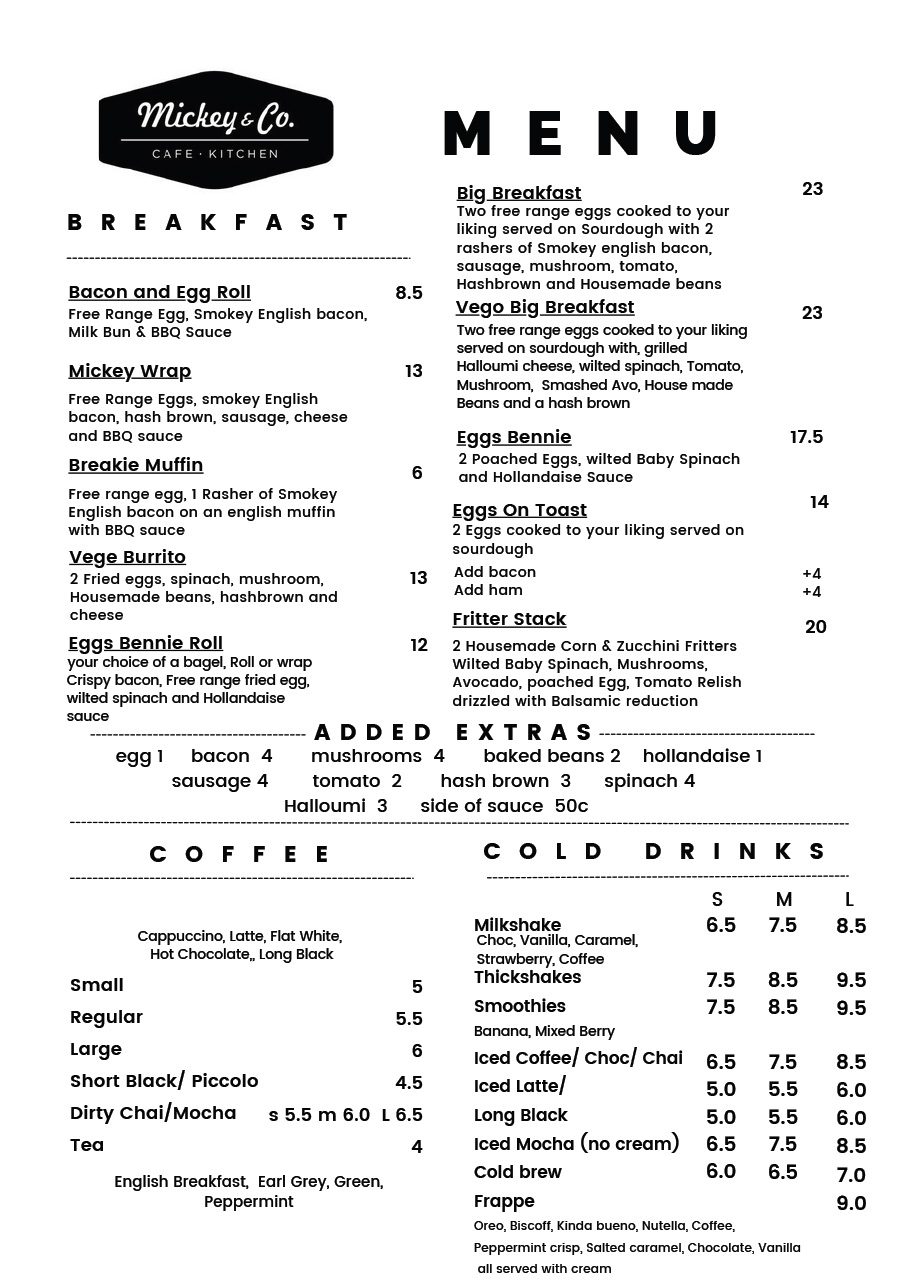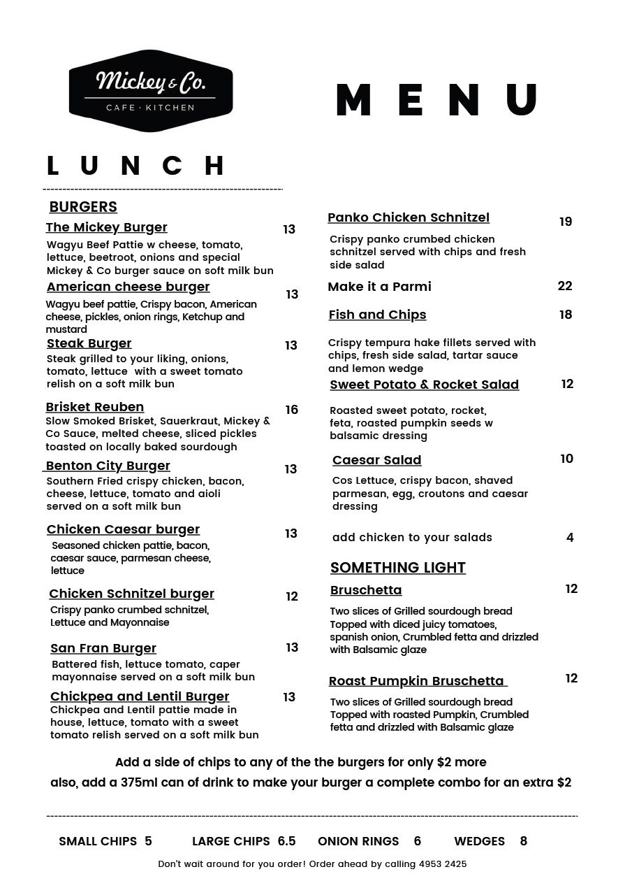 Enjoy your break at Mickey & Co. Whether working in the industrial area of Cameron Park or travelling down the M1, we have a wide range of to go foods as well as a breakfast and lunch menu for you to enjoy.